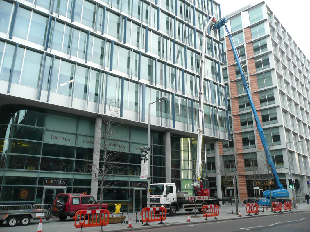 This time we supplied the lightweight Crane and all permits to set up on the footpath outside Bankside Buildings, in in Southwark Street London to replace a broken window panel.